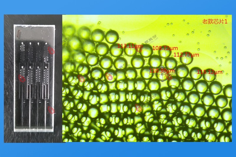 There are standard and customized glass chips for oil-in-water droplets. By controlling the flow velocity of water-phase and oil-phase in the chip, droplets of different particle sizes are formed, and
